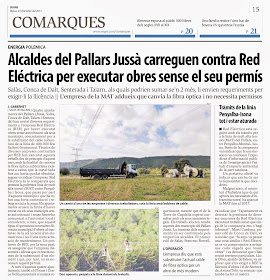 La noticia, que podéis ampliar en http://www.pallarsdigital.cat/jussa/item/1098-red-electrica-compra-els-terrenys-de-figuerola-d-orcau-per-construir-la-subestacio-electrica-de-la-mat, unida a la que, como habréis visto, recogía igualmente Segre el pasado jueves, informando de los requerimientos de varios ayuntamientos del Pallars a Red Eléctrica de España por llevar a cabo obras en la línea de 400 kV. Sentmenat-Sallent al paso por sus municipios sin contar con su permiso, demuestra una vez más la desvergüenza de esta empresa, que actúa como si fuera dueña del territorio y estuviera por encima de las leyes. De hecho, lo más preocupante del asunto es comprobar cómo Red Eléctrica de España sigue adelante sin el menor pudor con sus planes de sacar adelante su anhelada Autopista Eléctrica Peñalba-Arnero-Isona pese a que, como explica el mismo diario Segre, al parecer el Ministerio de Industria ha aparcado el proyecto hasta el año 2017 (algo de lo que, sorprendentemente, no se nos había informado pese a ser afectados directos y haber presentado nuestras alegaciones en la fase de exposición e información pública del proyecto).