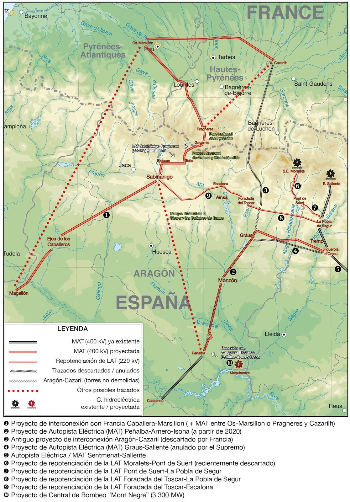 Per als que no coneixeu encara els projectes que ens afecten, acompanyem aquest post amb mapes dels seus traçats. Entre ells es troben els projectes d'interconnexió elèctrica a través del Golf de Biscaia, del Pirineu navarrès i del Pirineu aragonès i els projectes d'autopistes elèctriques (400 kV) Güeñes-Itsaso, Itsaso-Muruarte-Castejón i Peñalba-Arnero-Isona, així com els projectes de repotenciació de línies d'alta tensió que aquests comporten.